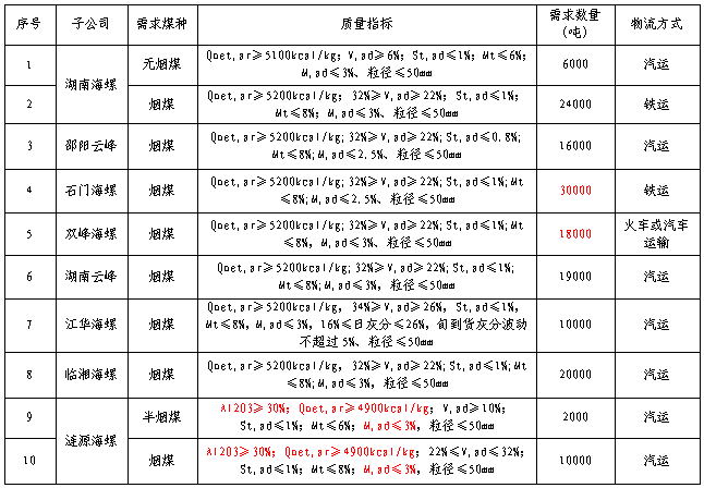 根據(jù)2022年11月21日-2022年12月20日海螺水泥湖南區(qū)域各子公司煤炭需求,現(xiàn)擬對(duì)煤炭進(jìn)行公開招標(biāo),選定中標(biāo)人,為體現(xiàn)公平、公正、公開的原則,拓寬采購(gòu)渠道,現(xiàn)將招標(biāo)相關(guān)事宜公告如下: