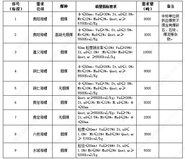 海螺水泥貴州區(qū)域擬對2022年12月5日至2022年12月20日生產(chǎn)用煤炭進(jìn)行公開招標(biāo),選定中標(biāo)單位,現(xiàn)將相關(guān)招標(biāo)事宜公示如下: