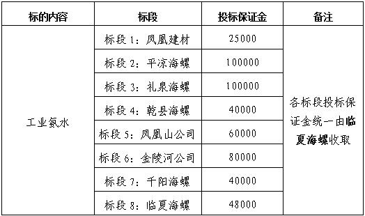 本次氨水招標(biāo)分臨夏海螺、禮泉海螺、乾縣海螺、鳳凰山公司、金陵河公司、千陽(yáng)海螺、平?jīng)龊B?、鳳凰建材8個(gè)標(biāo)段,若投標(biāo)人只投一個(gè)標(biāo)段(臨夏海螺標(biāo)段、禮泉海螺標(biāo)段、乾縣海螺標(biāo)段、鳳凰山公司標(biāo)段、金陵河公司標(biāo)段、千陽(yáng)海螺標(biāo)段、平?jīng)龊B輼?biāo)段、鳳凰建材標(biāo)段),則只需繳納對(duì)應(yīng)標(biāo)段的投標(biāo)保證金,若投標(biāo)2個(gè)及以上標(biāo)段則按照對(duì)應(yīng)標(biāo)段投標(biāo)保證金累加計(jì)算并繳納,匯款需注明具體投標(biāo)的標(biāo)段。