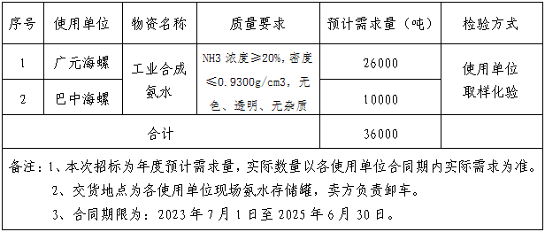 川渝區(qū)域廣元海螺、巴中海螺2023-2025年生產脫硝用工業(yè)合成氨水,具體信息如下表: