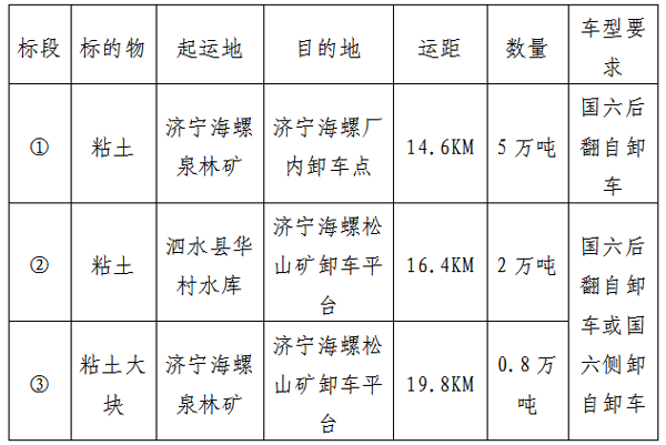 1.標(biāo)的物:標(biāo)段①、②粘土運(yùn)輸;標(biāo)段③粘土大塊運(yùn)輸。
