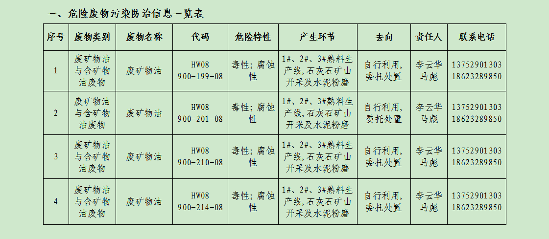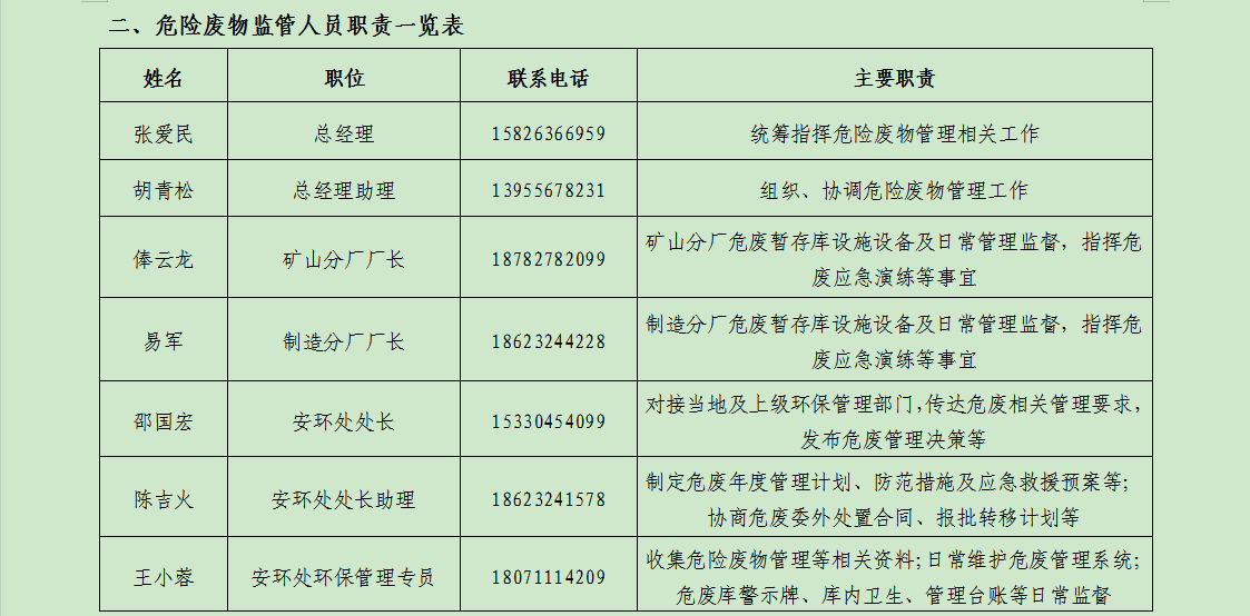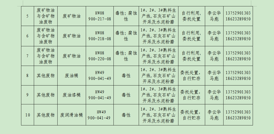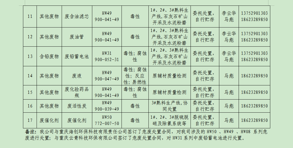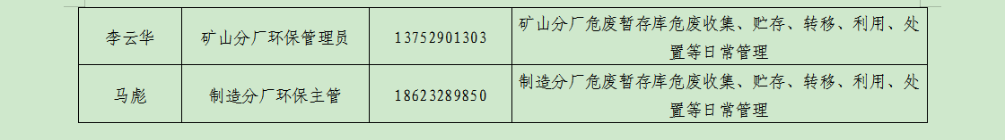 廢棄物的產(chǎn)生單位及管理:礦山分廠(chǎng)由俸云龍負(fù)責(zé)管理,負(fù)責(zé)督促員工把產(chǎn)生的危廢分類(lèi)定期送危廢庫(kù)暫存,危廢庫(kù)由維修工段工段長(zhǎng)負(fù)責(zé),負(fù)責(zé)收集并記錄危廢臺(tái)賬;主廠(chǎng)區(qū)由易軍負(fù)責(zé)管理,負(fù)責(zé)督促員工把產(chǎn)生的廢分類(lèi)定期送危廢庫(kù)暫存,危廢庫(kù)由環(huán)保主管馬彪負(fù)責(zé),負(fù)責(zé)收集并記錄危廢臺(tái)賬。危廢庫(kù)危廢定期聯(lián)系重慶海創(chuàng)環(huán)??萍加邢挢?zé)任公司、重慶云青環(huán)??萍加邢薰?/span>等有資質(zhì)公司回收處理并完善相應(yīng)危廢聯(lián)單。