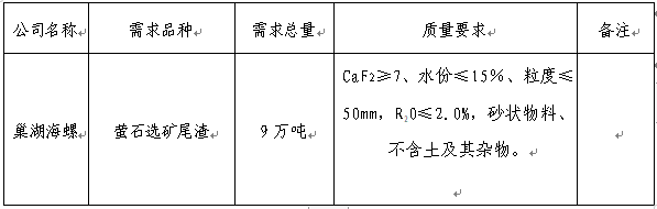 為做好巢湖海螺水泥有限責(zé)任公司螢石選礦尾渣供應(yīng)工作,確保產(chǎn)品的可靠性、穩(wěn)定性,規(guī)范采購行為,本著“公開、公平、公正”的競爭原則,選擇經(jīng)營能力較好、產(chǎn)品質(zhì)量較優(yōu)、保供和服務(wù)能力較強(qiáng)的供貨單位,特將本次招標(biāo)的有關(guān)事宜公告如下,歡迎有實力的投標(biāo)單位參加本次招投標(biāo)活動: