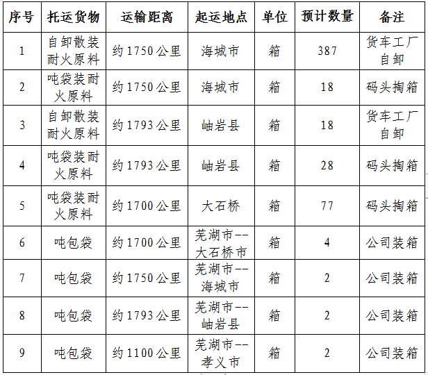 根據(jù)公司生產(chǎn)經(jīng)營(yíng)計(jì)劃,為確保國(guó)內(nèi)堿性耐火原材料及時(shí)、安全的運(yùn)輸至公司,滿(mǎn)足生產(chǎn)需要;同時(shí),規(guī)避海運(yùn)季節(jié)性?xún)r(jià)格漲跌風(fēng)險(xiǎn),降低運(yùn)輸成本。現(xiàn)本著“公開(kāi)、公平、公正、透明”的原則公開(kāi)招標(biāo),誠(chéng)邀經(jīng)營(yíng)能力較好、運(yùn)輸資質(zhì)合格、保供和服務(wù)能力較強(qiáng)的運(yùn)輸單位參加投標(biāo),現(xiàn)將有關(guān)事項(xiàng)公告如下: