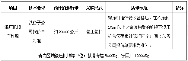省內(nèi)區(qū)域擬對區(qū)域內(nèi)兩家家公司(荻港海螺、寧國廠,共2家)2024年度水泥磨用耐磨焊絲進行聯(lián)合招標采購,為進一步體現(xiàn)公開、公平、公正、擇優(yōu)的原則,拓寬采購渠道,保證采購質(zhì)量,現(xiàn)將招標采購信息發(fā)布如下: