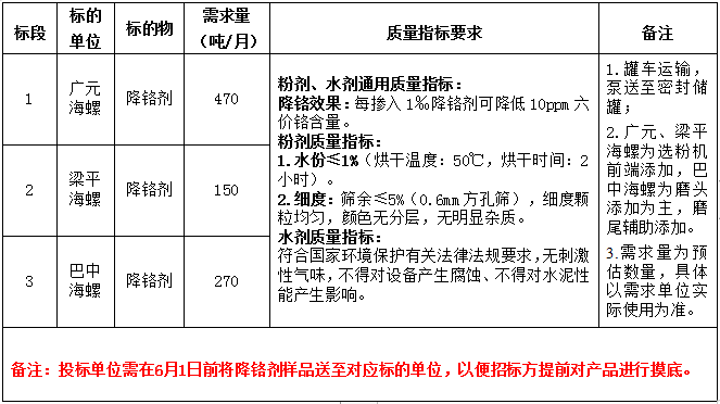 根據(jù)廣元、梁平、巴中海螺三公司生產(chǎn)經(jīng)營(yíng)計(jì)劃需求,現(xiàn)對(duì)2024年7月-2025年6月期間水泥生產(chǎn)用降鉻劑進(jìn)行公開(kāi)招標(biāo),為體現(xiàn)公平、公正、公開(kāi)、透明的原則,現(xiàn)將招標(biāo)相關(guān)事宜公告如下: