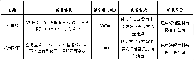 根據(jù)我公司商砼生產(chǎn)經(jīng)營(yíng)對(duì)外購砂石需要,現(xiàn)擬開展巴中海螺建材外購砂石招標(biāo)采購工作,為規(guī)范物資采購行為,嚴(yán)格遵循公平、公正、公開的原則,現(xiàn)將招標(biāo)采購信息發(fā)布如下: