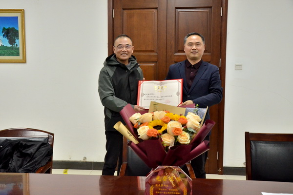 支部書(shū)記給退休職工頒發(fā)榮譽(yù)證書(shū)