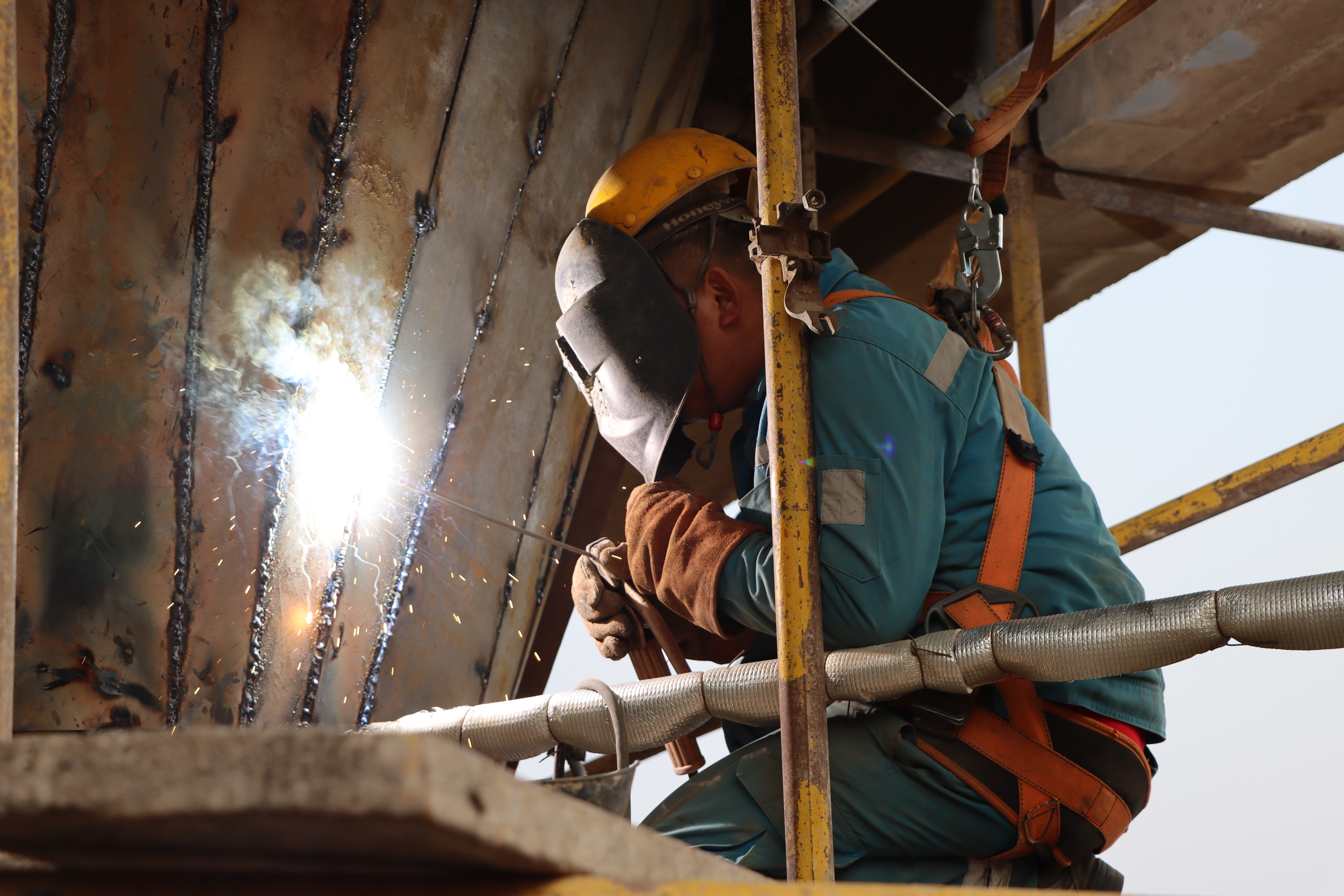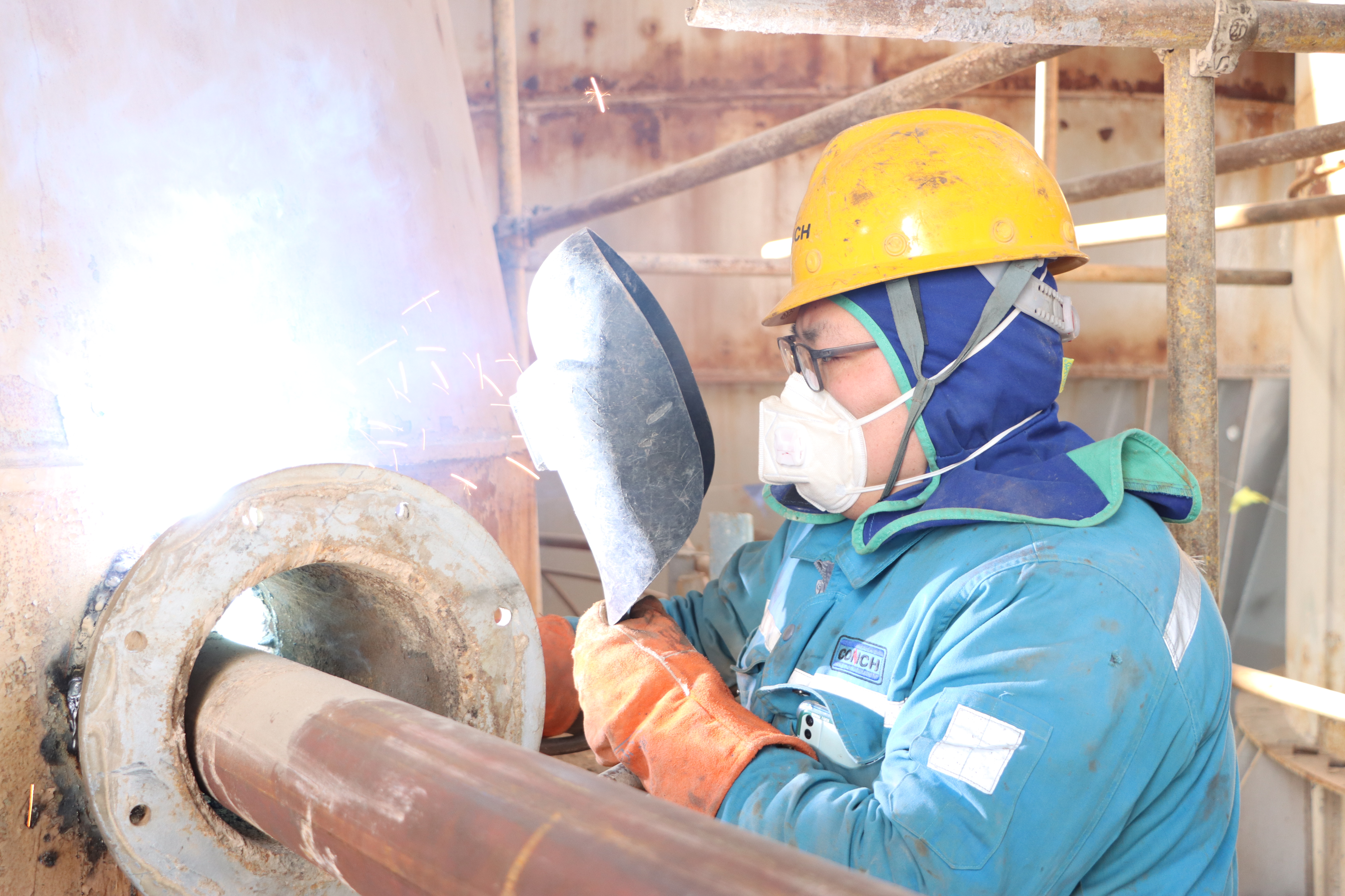 檢修現(xiàn)場冷風穿梭,金屬生冷,有這樣一群“焊”衛(wèi)者,他們裹著厚重工裝,雙手在寒風中略顯僵硬,卻精準操控焊槍,電流電壓在專注間調(diào)校妥當。正在進行分解爐安全防護層法蘭口焊接的是機械維修工謝道俊,也是同事心中可愛的“小胖”,飛濺的火花映照著他堅毅臉龐,每一次精準熟練的操作,都是為檢修期間預熱器系統(tǒng)清理結(jié)皮、澆注料施工等作業(yè)建立的一道安全屏障。