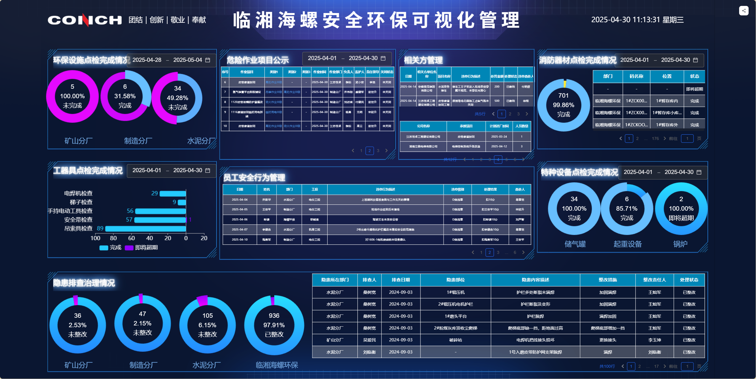 公司高度重視安全文化創(chuàng)建,組織全體員工層層簽訂《安全職業(yè)健康目標(biāo)責(zé)任書》,形成層層負(fù)責(zé)、人人有責(zé)、各負(fù)其責(zé)的安全生產(chǎn)工作體系。利用“獎優(yōu)罰劣”機制鼓勵每位員工開展安全隱患隨手曝工作,切實提升了作業(yè)現(xiàn)場的安全管控能力和員工安全風(fēng)險辨識能力。每年對照國家法律法規(guī)梳理更新公司安全規(guī)章制度,實現(xiàn)企業(yè)安全管理合法化規(guī)范化。公司還利用草料二維碼平臺搭建安全環(huán)保管理平臺,聯(lián)動百度sugarAI將各安全管理落實完成率在公司大廳進(jìn)行可視化展示。通過“四化”(規(guī)范化、標(biāo)準(zhǔn)化、信息化、精細(xì)化)管理為依托,公司全面建設(shè)了具有特色的安全文化。