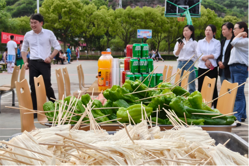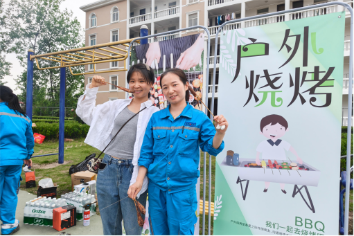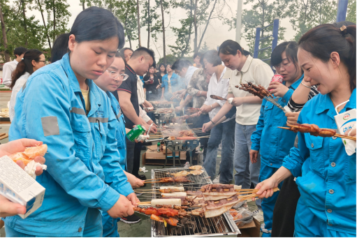 4月29日下午,職工活動中心外的羽毛球場成了歡樂海洋。不銹鋼托盤里,秘制雞翅、孜然牛肉、羊肉串、魷魚、五花肉串堆得冒尖,花菜、青椒、金針菇整齊碼放,等待炭火炙烤。炭火噼啪作響,油脂滴落在火焰上,騰起陣陣帶著孜然香氣的白煙。裝運(yùn)分廠的錢小紅左右翻轉(zhuǎn),將烤得金黃的肉串分給周圍的年輕人:“嘗嘗我這手藝,保準(zhǔn)比外頭攤子上的還香!”