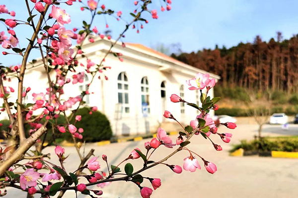 “無人會(huì)得東風(fēng)意,春色都將付海棠”。在食堂門前,一株株海棠嬌艷似少女的笑靨,微風(fēng)輕拂,花朵如粉蝶般飄舞。