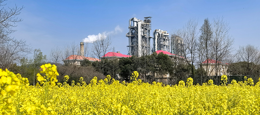 金色的油菜花遍布公司周邊,與公司內(nèi)的員工宿舍和水泥窯相映成趣,勾勒出一幅絢麗多彩的春日田園畫卷。