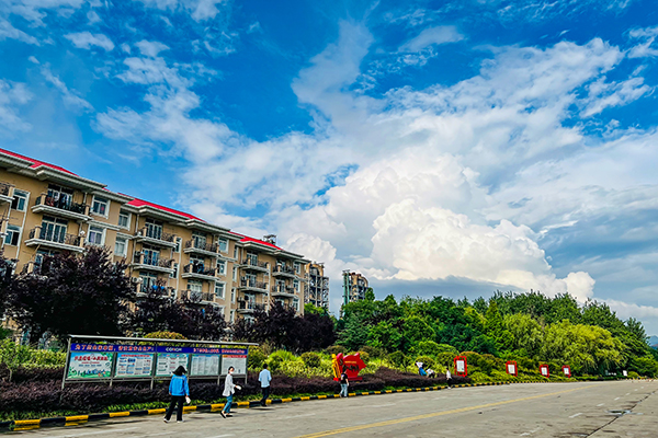 藍(lán)天白云悠然鋪展,公司萬噸線宿舍樓與蔥郁綠植相映成趣,行人于開闊道路間漫步,在晴朗日光里勾勒出一幅閑適生動(dòng)的生活畫卷。