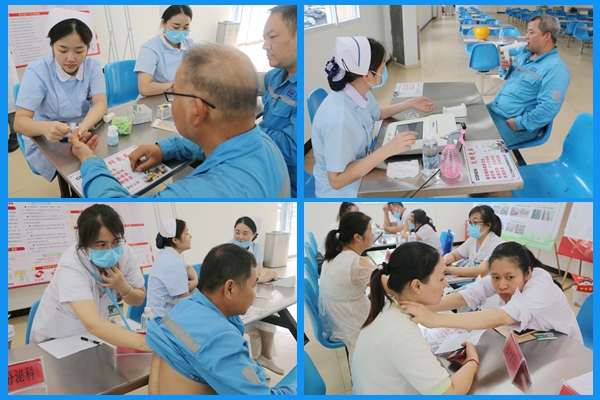 講座結(jié)束后,來自普通外科、內(nèi)分泌科、呼吸內(nèi)科、婦科、中醫(yī)康復(fù)科、檢驗科等科室的資深專家在職工食堂一字排開,為員工提供包括血壓血糖檢測、心肺聽診、B超檢查、中醫(yī)把脈等在內(nèi)的全方位健康服務(wù)。專家們不僅耐心解答各類健康疑問,更針對水泥行業(yè)常見的職業(yè)健康問題給予了專業(yè)指導(dǎo)。