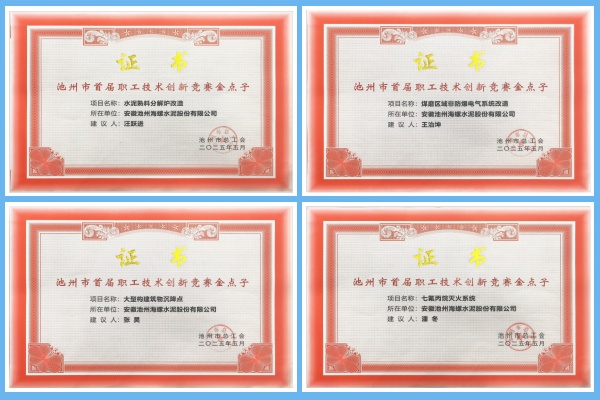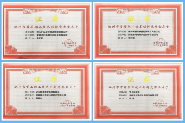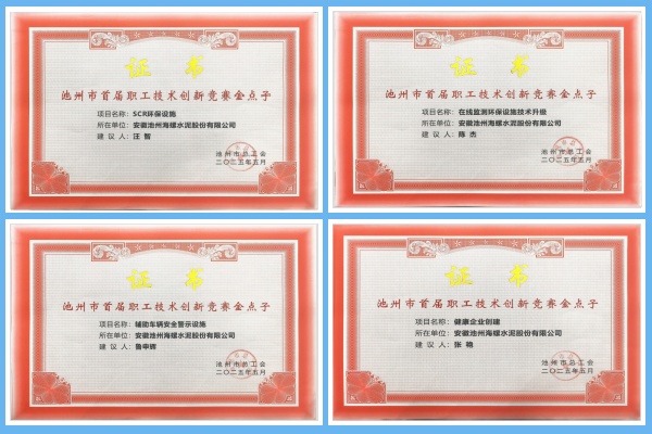 2025年11月,池州海螺榮獲池州市總工會頒發(fā)的多項證書嘉獎,以表彰其在池州市首屆職工技術創(chuàng)新競賽中所取得的優(yōu)異成績。