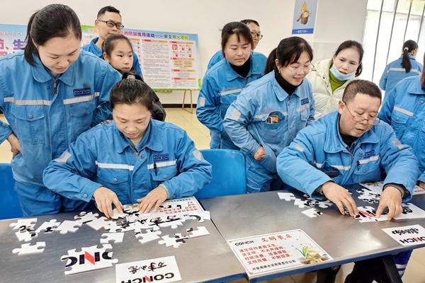 在本次迎新春活動(dòng)中,“拼出未來·新年‘拼’好運(yùn)”拼圖游戲以其獨(dú)特的設(shè)計(jì)和寓意深受喜愛。以海螺水泥標(biāo)識為核心視覺元素,巧妙融入春節(jié)傳統(tǒng)紋樣與吉祥符號,既彰顯企業(yè)文化認(rèn)同,又傳遞出濃濃的年節(jié)氛圍。參與者凝神聚力、專注拼合每一塊圖塊,爭分奪秒呈現(xiàn)完整畫面。這一過程不僅考驗(yàn)參與者的觀察力與耐心,更通過視覺化的方式,深化了職工對企業(yè)品牌的感知與認(rèn)同,也寓意著每一位職工都是企業(yè)宏圖的一塊重要拼圖,共同拼出新年新氣象。